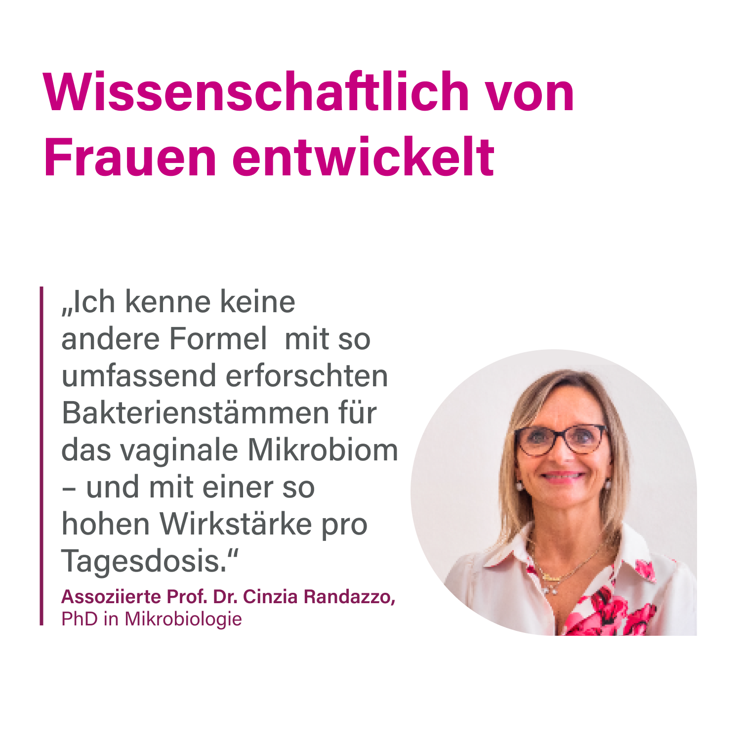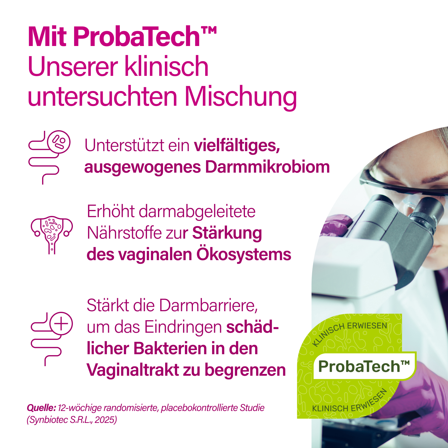 Die Formel enthält zudem die gut dokumentierten Stämme Lactobacillus acidophilus La-14® und Lacticaseibacillus rhamnosus HN001™. Diese wurden klinisch untersucht und zeigten eine Wiederherstellung des mikrobiellen Gleichgewichts innerhalb von nur 7 Tagen sowie eine deutliche Linderung von Symptomen wie Juckreiz und Ausfluss nach 14 Tagen Anwendung.