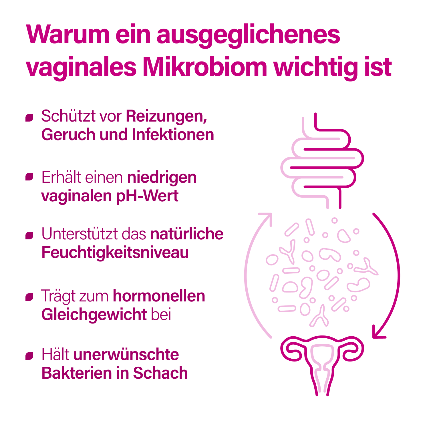 Über 75 % der Frauen erleben im Laufe ihres Lebens Beschwerden im Intimbereich. Faktoren wie Stress, Antibiotika, Ernährung oder hormonelle Veränderungen können das vaginale Milieu aus dem Gleichgewicht bringen und die Anfälligkeit für Reizungen erhöhen. Die vaginale Mikrobiota spielt eine zentrale Rolle im körpereigenen Abwehrsystem – wird ihre Zusammensetzung gestört, können Symptome wie Juckreiz, Ausfluss, unangenehmer Geruch oder Trockenheit auftreten.
