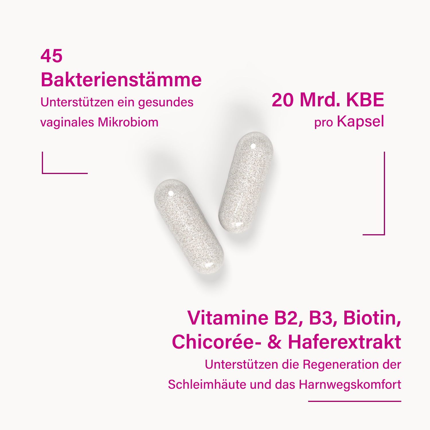 - 1Jede Kapsel liefert hochwertige Milchsäurebakterien-Stämme, die nachweislich den Verdauungstrakt überleben und über die Darm-Vagina-Achse den Intimbereich erreichen.